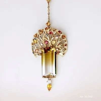 Вставка: 8 Бриллиант Кр 57 (200 400) 0.066 сt 3/5А; 1 Бриллиант Кр 57 (200 400) 0.100 сt 4/4А; 20 сапфир цв. облаг. 1,856 сt; 1 Полихромный кварц 11,96 сt.
