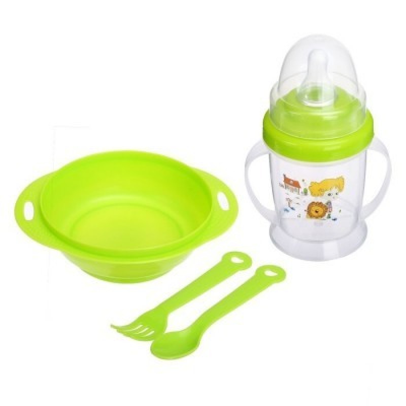 Набор детской посуды, 4 предмета: миска 200 мл, бутылочка для кормления 180 мл, ложка, вилка,Товар без выбора определенного цвета. Детская посуда подходит для кормления и самостоятельных приемов пищи малышом. Пластиковые изделия не бьются и мало весят.